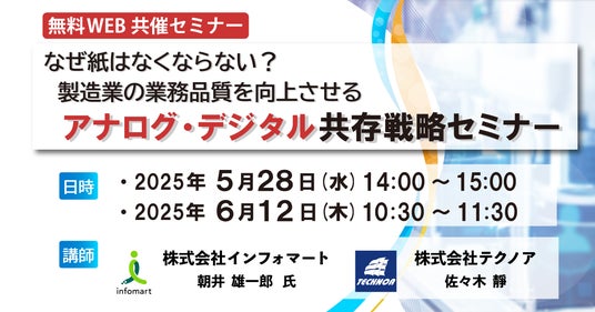 株式会社テクノア(本社:岐阜県岐阜市、代表取締役:山崎 耕治)は、2025年5月28日と、2025年6月12日に、株式会社インフォマート(本社:東京都港区、代表取締役社長:中島 健、以下「インフォマート」)と共同で、製造業の業務品質を向上させる無料WEBセミナー「アナログ・デジタル共存戦略セミナー」を開催いたします。