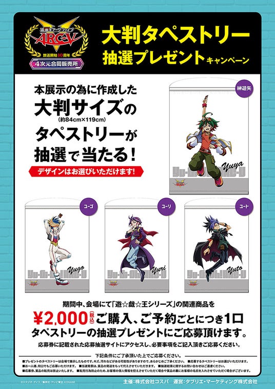 開催期間中、会場にて「遊☆戯☆王シリーズ」の関連商品を¥2,000(税込)ご購入・ご予約ごとに1口、タペストリーの抽選プレゼントにご応募いただけます。応募券に記載された応募抽選サイトにアクセスし、必要事項をご記入頂きご応募ください。