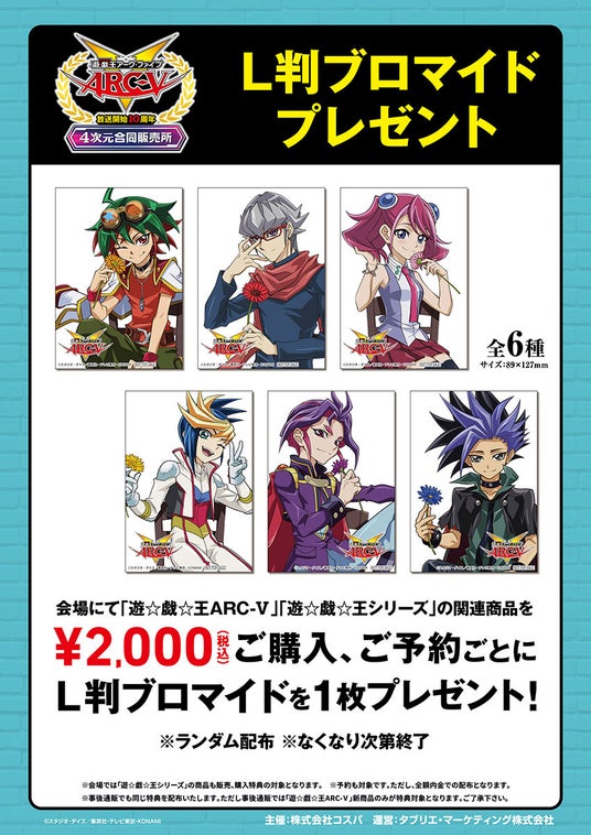 会場にて「遊☆戯☆王ARC-V」「遊☆戯☆王シリーズ」の関連商品¥2,000(税込)お買上ごとにL判ブロマイド(全6種/サイズ89x127mm)をランダムで1枚プレゼント。