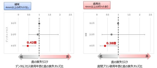健常群においては、デンタルフロスを0~1年使用する者に比べて、4~5年使用者は歯の喪失に対するオッズ比が0.42倍、歯周炎群では、歯間ブラシの使用期間が0~1年の者に比べて、4~5年使用している者の歯の喪失に対するオッズ比が0.38倍と、歯間清掃具を長期使用する群では歯を失うリスクが低くなることが分かりました(図)。