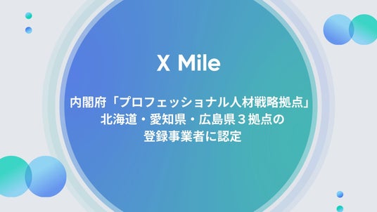 ノンデスク産業に特化したHRプラットフォーム「クロスワーク」を展開するX Mile株式会社(クロスマイル、本社:東京都新宿区、代表取締役:野呂 寛之、以下「当社」)は、この度、内閣府が推進する「プロフェッショナル人材戦略拠点」事業において、当社が拠点を保有する3拠点(北海道・愛知県・広島県)の登録民間人材ビジネス事業者に認定されましたことをお知らせいたします。