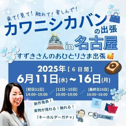 「 愛されるものづくり」をビジョンに掲げる香川県のカバンメーカー、株式会社カワニシカバンプロダクト(本社:高松市太田上町、代表取締役社長:川西功志)は、愛知県名古屋市の星が丘テラス WEST2Fで、カワニシカバン商品の魅力を伝える展示会イベント「カワニシカバンの出張in名古屋」を2025年6月11(水)~16(月)の6日間で開催いたします。