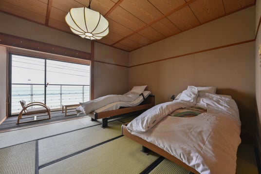 お食事処に近い3階フロアのお部屋を改修いたしました。お部屋は全室オーシャンビューで伊勢湾を一望できます。リクライニングベッド2台で角度調整も可能。和室は12.5畳の広さで、車椅子での移動や介助にも十分なスペースを確保しています。また、源氏物語の世界観や薫りをお愉しいただけます。