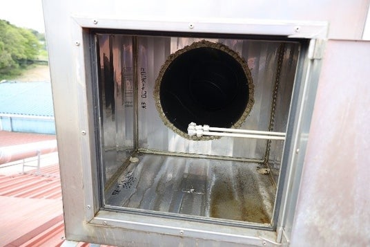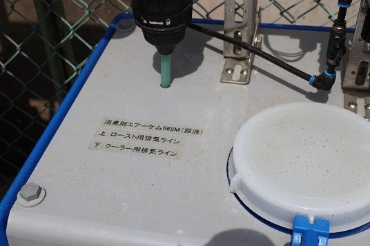 初期の計画では「脱臭機」の使用を検討していましたが、サイズが想定より大きく、設置場所の確保が困難であったこと、また、設置場所付近にある通気式ドライヤー周辺の温度が170℃を超えるため、「脱臭機」の変形リスクがありました。