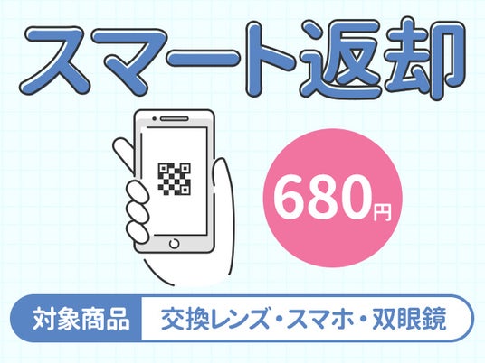 本サービスは、対象商品(交換レンズ、スマートフォン、双眼鏡)の返却を、スマホからの簡単操作で行える仕組みです。ご予約時にご返却送料として一律680円をお支払いいただくだけで、主要四島(沖縄・離島を除く北海道、本州、四国、九州)からなら、送り状の記入不要でご返却いただけます。