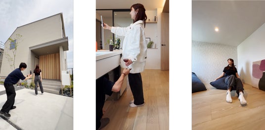 今回の動画は“暮らしやすさ”をかなえる「回遊動線」を表現するため、最初から最後まで編集によるカット割りをせずに一気に撮影する手法で制作されました。「あやんぬ」さんの動きに合わせ、「かっちゃん」が先回りする姿は緊張感があふれ、最初から最後まで目の離せない迫力のある動画となっています。