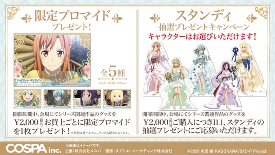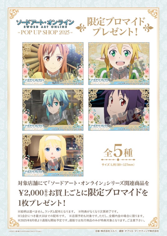 対象店舗にて『ソードアート・オンライン』シリーズ関連商品を2,000円(税込)お買上ごとに限定ブロマイド(全5種)を1枚プレゼント!