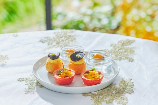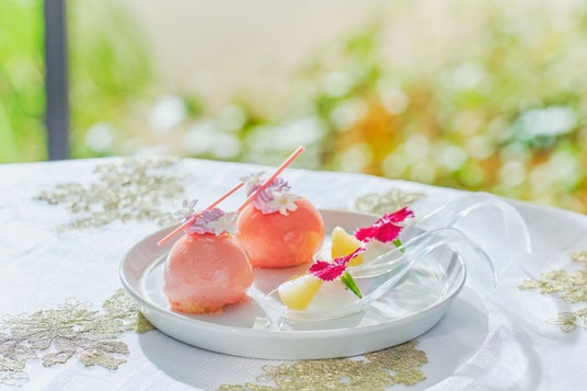 桃のフレーバーを効かせたジュレや桃のコンポートの涼しげなヴェリーヌ、見た目も可愛らしいローズクリームのタルトやマカロン、洋梨の甘味と酸味が上品な味わいのレアチーズテリーヌ、桃とライチのジュレが詰まったクリーミーな桃のムース、暑い夏にさっぱりと食べられる桃とヨーグルトのスプーンデザートなど桃と薔薇づくしのスイーツ6種を提供。セイボリーは、オマール海老とブロッコリーの涼しげなフォルムのアスピックや、トリュフを乗せた卵のグージェール、とうもろこしとクリームチーズのプティキッシュの3種をお楽しみいただけます。また、フレンチレストラン「グラマシースイート」では、上記のセイボリーにプラスして、お酒との相性も抜群な生ハムとグリッシーニや、鶏むね肉とラタトゥイユのオープンサンド、桃の冷製スープの3種もお楽しみいただけます。
