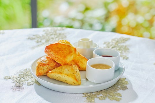 ・スコーン(ミルク/紅茶) ・コンディメント(塩クロテッドクリーム/桃のジャム/ブルーベリージャム)