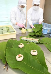 初夏の味覚「朴(ほお)葉ずし」の製造が、下呂市内の食品加工会社で始まり、芳香を放つ新緑のホオノキの葉で酢飯を包む作業に従業員らが追われている。