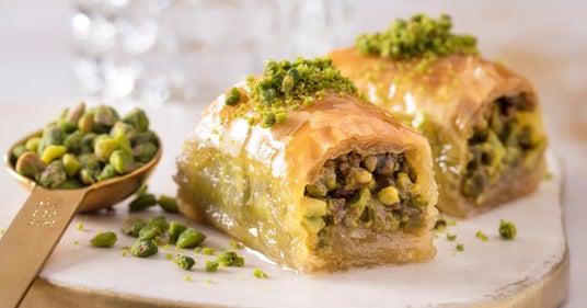 薄いパイ生地を手作業で幾層にも重ね、砕いたピスタチオやくるみをたっぷり挟み焼き上げ、甘いシロップをかけて仕上げたトルコの伝統菓子。