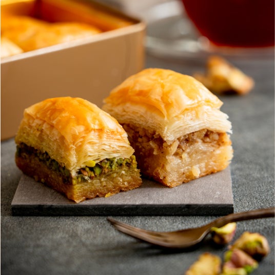 ナーディル・ギュルのバクラヴァは上品な甘さと、高級なピスタチオやくるみなどのナッツの味わいが特長。オスマン帝国時代から愛されている、一度食べたら忘れられないナッツとパイ生地のハーモニーをお楽しみください。