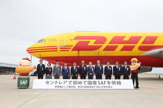 コスモエネルギーホールディングス株式会社(代表取締役社長:山田 茂)のグループ会社であるコスモ石油株式会社(代表取締役社長:西 克司、以下「コスモ石油」)、コスモ石油マーケティング株式会社(代表取締役社長:高山 直樹、以下「コスモ石油マーケティング」)は、廃食用油を原料とした国内初の大規模生産による国産SAF(Sustainable Aviation Fuel:持続可能な航空燃料)を、5月23日に中部国際空港(以下「セントレア」)において、DHL Express(CEO:ジョン ピアソン 本社:ドイツ・ボン)が運航する定期航空貨物便に初めて供給したことをお知らせします。セントレアにおける航空機へのSAF供給は今回が初めてです。コスモエネルギーグループが手掛ける国産SAFの供給により、空港周辺地域で回収された廃食用油がSAF原料として利用され、セントレアを起点としたSAFサプライチェーンが本格始動したことは、地域と連携した資源循環の推進において重要な一歩となります。