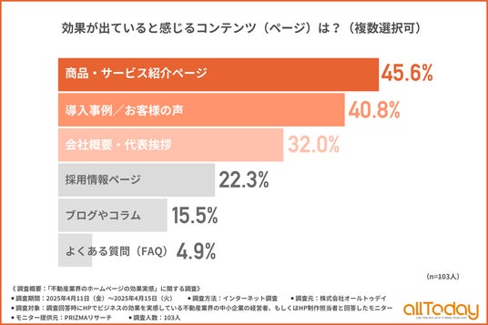 株式会社オールトゥデイ(本社所在地:埼玉県さいたま市)は、HPでビジネスの効果を実感している不動産業界の中小企業の経営者、もしくはHP制作担当者を対象に、「不動産業界のホームページの効果実感」に関する調査を実施しましたので、その結果を公表します。