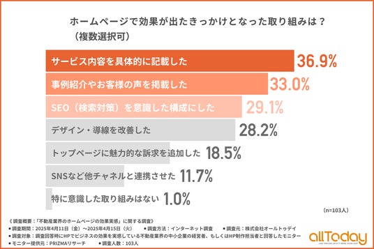 「ホームページで効果が出たきっかけとなった取り組み」について尋ねたところ、『サービス内容を具体的に記載した(36.9%)』と回答した方が最も多く、『事例紹介やお客様の声を掲載した(33.0%)』『SEO(検索対策)を意識した構成にした(29.1%)』となりました。