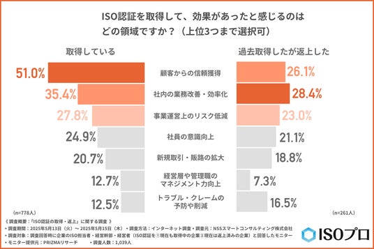 そして、今回の調査で注目すべきは、「ISO認証の効果」において、取得中と返上済みの企業で明確な差が出た点です。