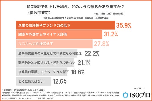 「ISO認証を返上した場合の懸念」について尋ねたところ、『企業の信頼性やブランド力の低下(35.9%)』が最も多く、『顧客や外部からのマイナス評価(31.2%)』『リスクへの危機感低下(27.8%)』と続きました。