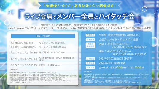 さらにアルバムの発売を記念して、ファンとの距離をぐっと近づけるオフラインイベントの実施も決定。内容は、推しメンバーを選んで参加できるリアルハイタッチ会、さらには、いれいすとしては初となる今回の夏ツアーのライブ終演後に実施されるメンバー全員とのハイタッチ会となっております。アルバムを購入しご応募いただいた方の中から当選した方をご案内いたします。