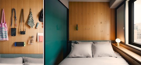 その象徴が、ダブルルーム、キングルーム、クイーンルームに設けた、ベッド頭元の有孔ボード。収納用パーツを自由に組み合わせて、自分らしく持ち物をレイアウトできる仕掛けです。旅のスタイルに合わせてカスタマイズし、まるで“自分だけのベース基地”のように空間を整えてお過ごしいただけます。