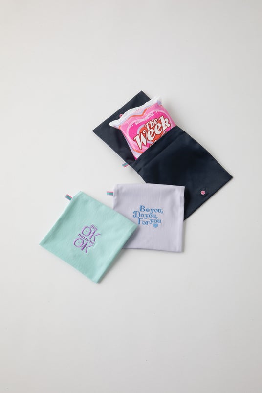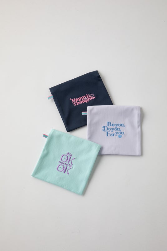 また、スクラブと同色のオリジナルポーチ(トップスポケットの刺繍メッセージとリンクしたデザイン)もセットでご用意。日常をそっと支えるアイテムとしてご活用いただけます。