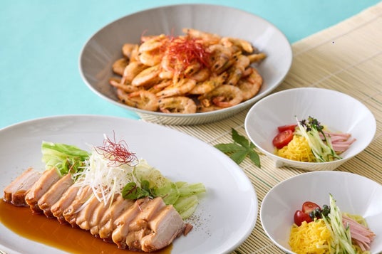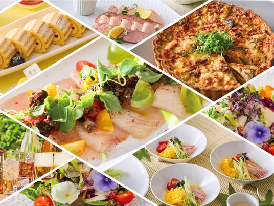 カンパチの柑橘マリネ ブラックオリーブのコンディメント/シャルキュトリーとピクルスの盛合わせ/愛知産のグリーンリーフサラダ 2種のドレッシング/ガーリック枝豆/シュリンプフリット/フライドポテト トリュフ風味/バッファローウィングチキン/キッシュ・ロレーヌ/インカの目覚めとさつまいものリヨネーズ風/豚ばらの和風ブレゼ 白髪ねぎと糸唐辛子をのせて/小さな冷やし中華 ごまだれで/ストリングスオリジナルお勧めデザート