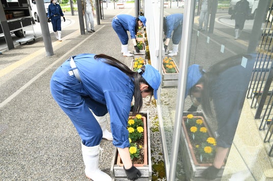 生徒たちは日々の授業で培った知識と技術を活かし、心を込めて育てた花々をひとつひとつ丁寧に配置。駅を利用する観光客や地域住民の皆さまに、花を通じて笑顔と季節の彩りを届けています。