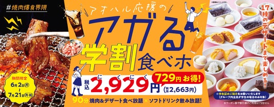 ワタミ株式会社(本社:東京都大田区、以下ワタミ)が全国で展開する、高品質な焼肉をリーズナブルな価格で提供する「焼肉の和民」は、2025年6月2日(月)から7月21日(月・祝)の期間限定で90分焼肉食べ放題×ソフトドリンク飲み放題の「学割食べホ」プランに17種のデザートの食べ放題も追加したアオハル応援の「アガる学割食べホ」プランを税込2,929(にくにく)円で販売します。