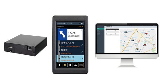 図1. 「廃棄物収集業務効率化システム」 イメージ(左から車載通信機器、経路ナビゲーション、車両積載状態を含めた車両位置(遠隔)確認画面)