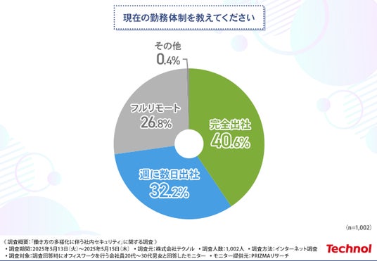 はじめに、「現在の勤務体制」について尋ねたところ、『完全出社(40.6%)』と回答した方が最も多く、『週に数日出社(32.2%)』『フルリモート(26.8%)』となりました。