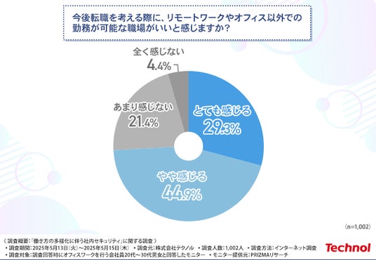 「今後転職を考える際に、リモートワークやオフィス以外での勤務が可能な職場がいいと感じるか」と尋ねたところ、約7割の方が『とても感じる(29.3%)』『やや感じる(44.9%)』と回答しました。