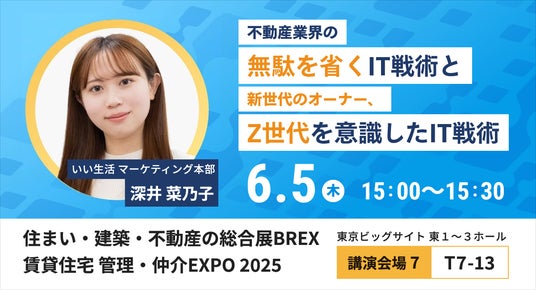 不動産業務を網羅するバーティカルSaaSと業務効率を推進するBPaaS(※1)で不動産市場のDXを推進する株式会社いい生活(東京都港区、代表取締役社長 CEO:前野 善一、東証スタンダード:3796、以下:いい生活)は、2025年6月4日(水)~ 6日(金)に開催される「住まい・建築・不動産の総合展 BREX」に出展します。また、5日(木)に予定されている特別講演では、いい生活 セールス&マーケティンググループ マーケティング本部 マーケティング部の深井 菜乃子が登壇します。