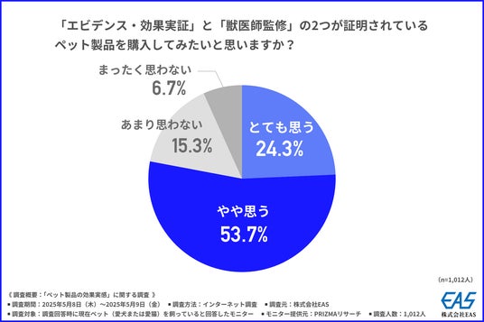 「「エビデンス・効果実証」と「獣医師監修」の両方が証明された製品を購入したいか」と尋ねたところ、『とても思う(24.3%)』『やや思う(53.7%)』と回答した方が約8割を占めました。