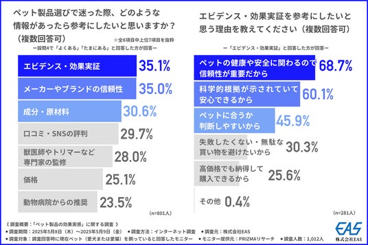 ペット製品選びで迷った際に参考にしたい情報としては、「エビデンス・効果実証」の他、「メーカーやブランドの信頼性」「成分・原材料」が多く挙がりました。