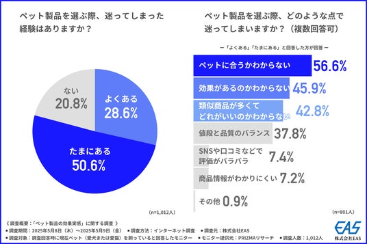 株式会社EAS(本社所在地:神奈川県横浜市、代表取締役:二分 茂礼)は、現在ペット(愛犬または愛猫)を飼っている方を対象に、「ペット製品の効果実感」に関する調査を実施しました。