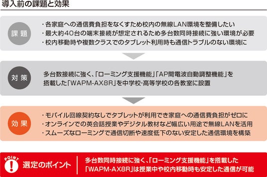 1898年、カトリック修道会・マリア会により設立された明星中学校・高等学校。同校ではGIGAスクール構想時に1人1台端末環境を実現し、デジタル教材を用いたタブレット授業を行っていました。しかし、キャリア通信モデルのタブレットを主にモバイル回線で利用していたため、各家庭への通信費が負担に。そこで、多台数同時接続に強く「ローミング支援機能」「AP間電波自動調整機能」を搭載したWi-Fiアクセスポイントで校内の無線LAN環境を整備・強化。生徒が各教室で無線LANを利用できるようになり、通信費の負担軽減と積極的なタブレット活用につながりました。