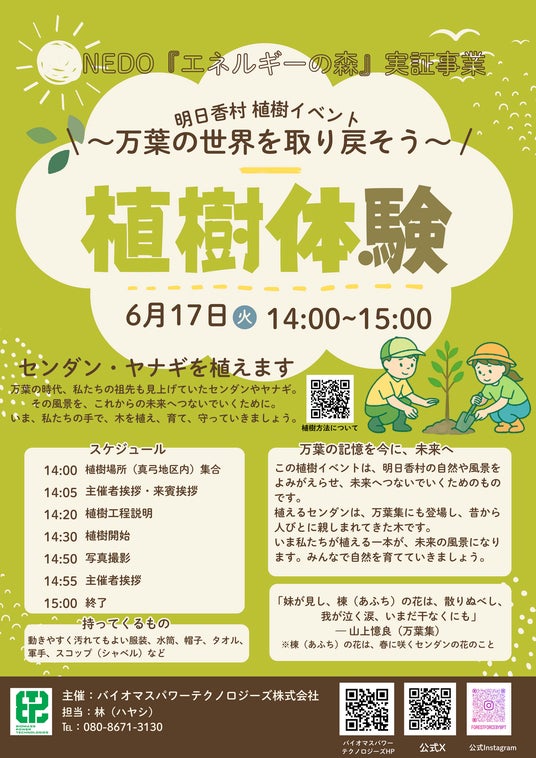 バイオマスパワーテクノロジーズ株式会社(三重県松阪市)は、来る6月17日に奈良県明日香村にて、NEDO「エネルギーの森」実証事業の一環として*1、地元中学校生を中心とする地元住民参加型で植樹イベントを開催します。