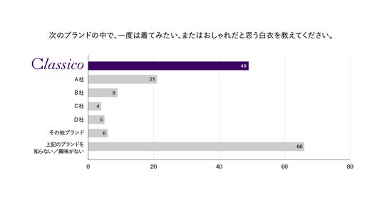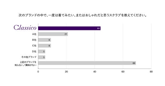 クラシコはこれまでも、医療現場で働く方々の声に寄り添い、現場に必要とされる機能性と感性を両立した製品づくりを続けてきました。2025年2月に実施した当社アンケート調査(*)では、クラシコが医師から「一度は着てみたい・おしゃれだと思うブランド」の白衣・スクラブで最も多くのお客様からに選ばれました。