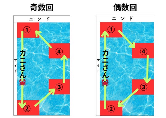 2.→3.、3.→4.、4.→1.は子どもたちのレベルに合わせ、赤台ジャンプから歩行、赤台ジャンプからバタ足、赤台ジャンプからクロールなどを行う。