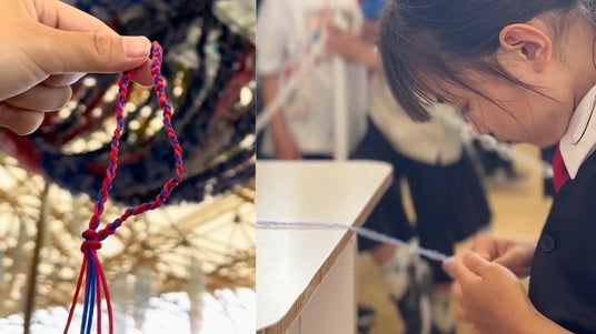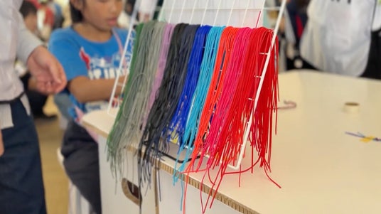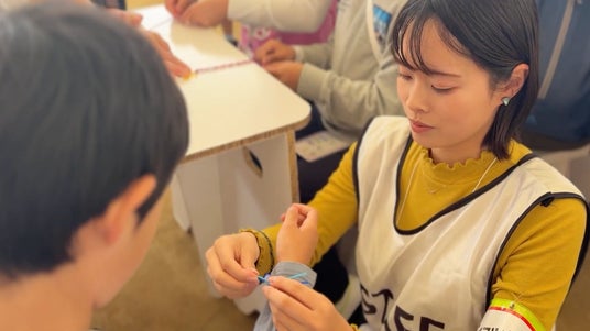 本ワークショップでは、年間3,000種類以上のゴム部品を製造する錦城護謨が、製造工程で生じるゴムの端材を活用し、「ゴムのミサンガ」づくりを実施。参加したこどもたちは、色や形を自由に選びながら五感を使って素材に触れ、世界に一つだけのオリジナル作品を完成させた。