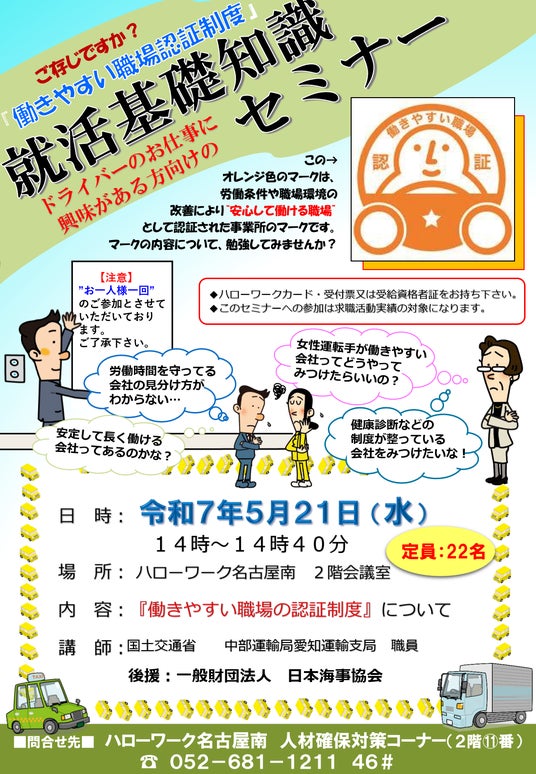2025年5月21日、ハローワーク名古屋南で開催された「就活基礎知識セミナー」にて、「働きやすい職場認証制度」が解説されました。