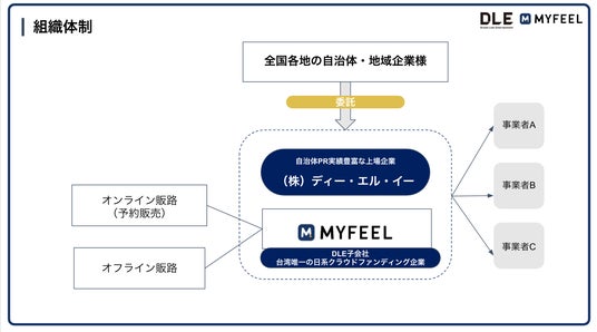 本事業スキームでは、自治体や地域企業はDLEに委託する形で参加します。実行はMYFEELが担い、オンライン・オフラインの両チャネルを活用して現地で展開を支援します。