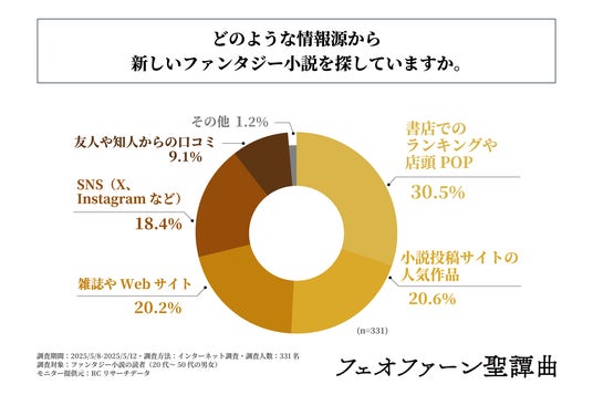 また、「どのような情報源から新しいファンタジー小説を探しているか」を尋ねる設問への回答では、1位が「書店でのランキングや店頭POP」で30.5%、2位が「小説投稿サイトの人気作品」で20.6%、3位が「雑誌やWebサイト」で20.2%という結果になりました。この結果から、作品の人気度を基準に新しいファンタジー作品を探している人が多いことがわかりました。
