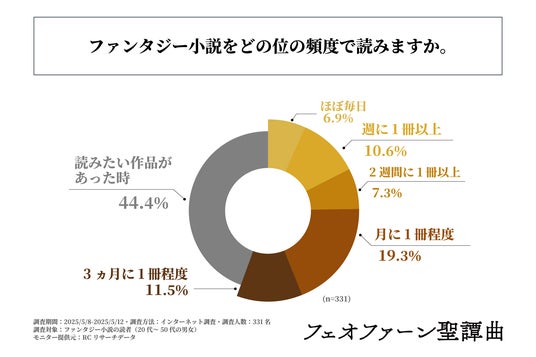 まず、「ファンタジー小説をどの位の頻度で読むか」を尋ねる設問への回答では、1位が「読みたい作品があった時」で44.4%、2位が「月に1冊程度」で19.3%、3位が「3ヵ月に1冊程度」で11.5%という結果になりました。この結果から、ファンタジー小説は読みたい作品があった時に読む人が多いことが明らかになりました。