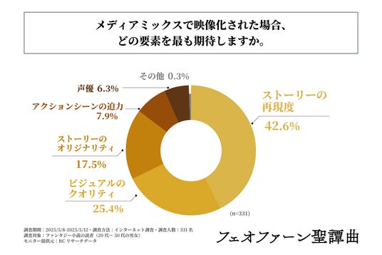 調査の最後、「メディアミックスで映像化された場合、どの要素を最も期待するか」を尋ねる設問の回答で多かったのは、1位が「ストーリーの再現度」で42.6%、2位が「ビジュアルのクオリティ」で25.4%、3位が「ストーリーのオリジナリティ」で17.5%という結果になりました。この結果から、映像化された場合「ストーリーの再現度」を最も期待する人が多いことが判明しました。