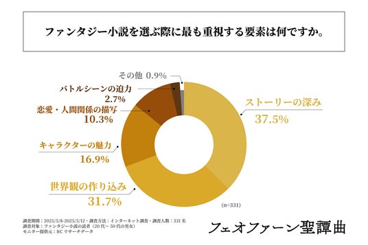 また、「ファンタジー小説を選ぶ際に最も重視する要素は何か」を問う設問への回答では、1位が「ストーリーの深み」で37.5%、2位が「世界観の作り込み」で31.7%、3位「キャラクターの魅力」で16.9%という結果になりました。この結果から、ファンタジー小説を選ぶ際は「ストーリーの深み」を最も重視する人が多いことが明らかになりました。