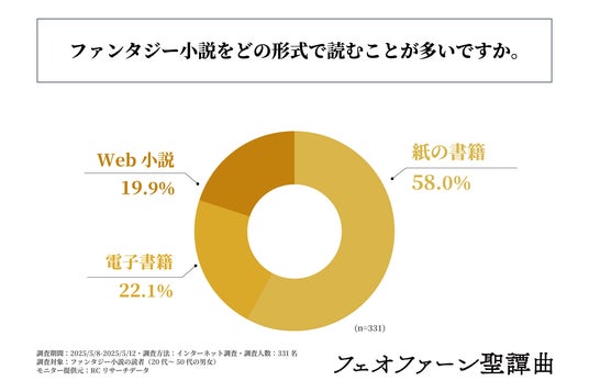 次に、「ファンタジー小説はどの形式で読むことが多いか」を尋ねる設問の回答では、1位が「紙の書籍」で58.0%、2位が「電子書籍」で22.1%、3位が「Web小説」で19.9%という結果になりました。この結果から、6割近い人が「紙の書籍」でファンタジー小説を読んでいることがわかりました。