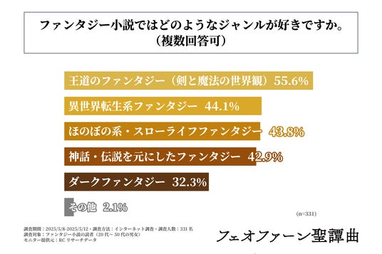 ・ファンタジー小説で好きなジャンルのトップ3は、1位「王道のファンタジー(剣と魔法の世界観)」、2位「異世界転生系ファンタジー」、3位「ほのぼの系・スローライフファンタジー」