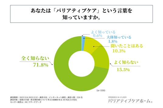 まず、「『パリアティブケア』という言葉を知っているか」を尋ねる設問への回答では、1位が「全く知らない」で71.8%、2位が「よく知らない」で15.5%、3位が「聞いたことはある」で10.3%という結果になりました。「大体知っている」と「良く知っている」と回答された方は合計しても3%未満であり、「聞いたことがある」と回答された方も10%ほどしかおらず、40代以上の男女で「パリアティブケア」という言葉を知っている人の割合は1割強であることが、この結果から明らかになりました。