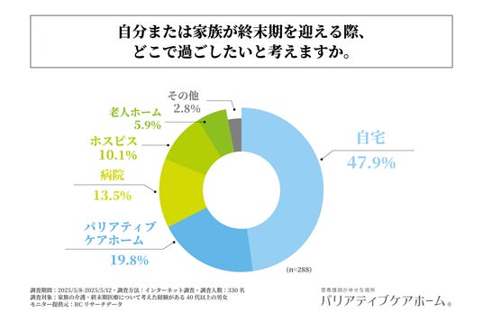 続いて、「パリアティブケア」という言葉を知らないと回答された方に「自分または家族が終末期を迎える際、どこで過ごしたいと考えるか」を尋ねる設問の回答では、1位が「自宅」で47.9%、2位が「パリアティブケアホーム」で19.8%、3位が「病院」で13.5%という結果になりました。「パリアティブケア」という言葉を知っている方の回答と比較すると、1位「自宅」2位「パリアティブケアホーム」の順位は変わらないものの、3位には「病院」が入る結果となりました。