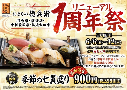 コロワイドグループの株式会社アトム(本社:神奈川県横浜市 代表取締役社長:田中公博)は、回転寿司業態のにぎりの徳兵衛 川原店(愛知県名古屋市)、植田店(愛知県名古屋市)、中村豊国店(愛知県名古屋市)、美濃太田店(岐阜県美濃加茂市)の4店舗にて、2025年6月6日(金)から12日(木)の7日間、「リニューアル1周年祭」を実施します。